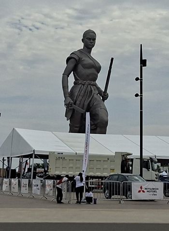 I spend the second part of my trip in Cotonou. Drivers take me to bookshops in the city by zem (with a helmet and hairnet provided by the driver), tricycle or car taxi. As we drive along the southernmost wide road parallel to the coastline, the gigantic Amazon monument rises up on the side. The statue of a female warrior from the Dahomey Kingdom is 30 metres high and was designed in China. Unveiled in 2022, it pays tribute to the legendary Amazons (Agoodjié or minons): an elite corps of highly trained women, famous for their fearlessness in combat, which existed from the early 18th century to the end of the 19th century. The image of the Am