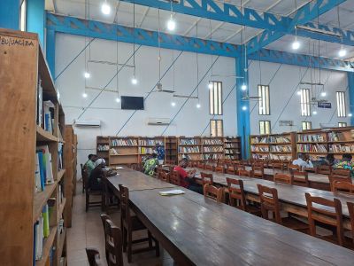 In the atmospheric university library on the campus of the University of Abomey-Calavi, long wooden tables seat nearly 400 students; around them are books in wooden cabinets along the wall. When I visit, there is plenty of space because it is holiday time, but at other times of the year there is not enough room for everyone who wants to study here. Purchasing books is difficult for the library because they are expensive. A collection of Japanese and Chinese books have been donated by the respective embassies. |