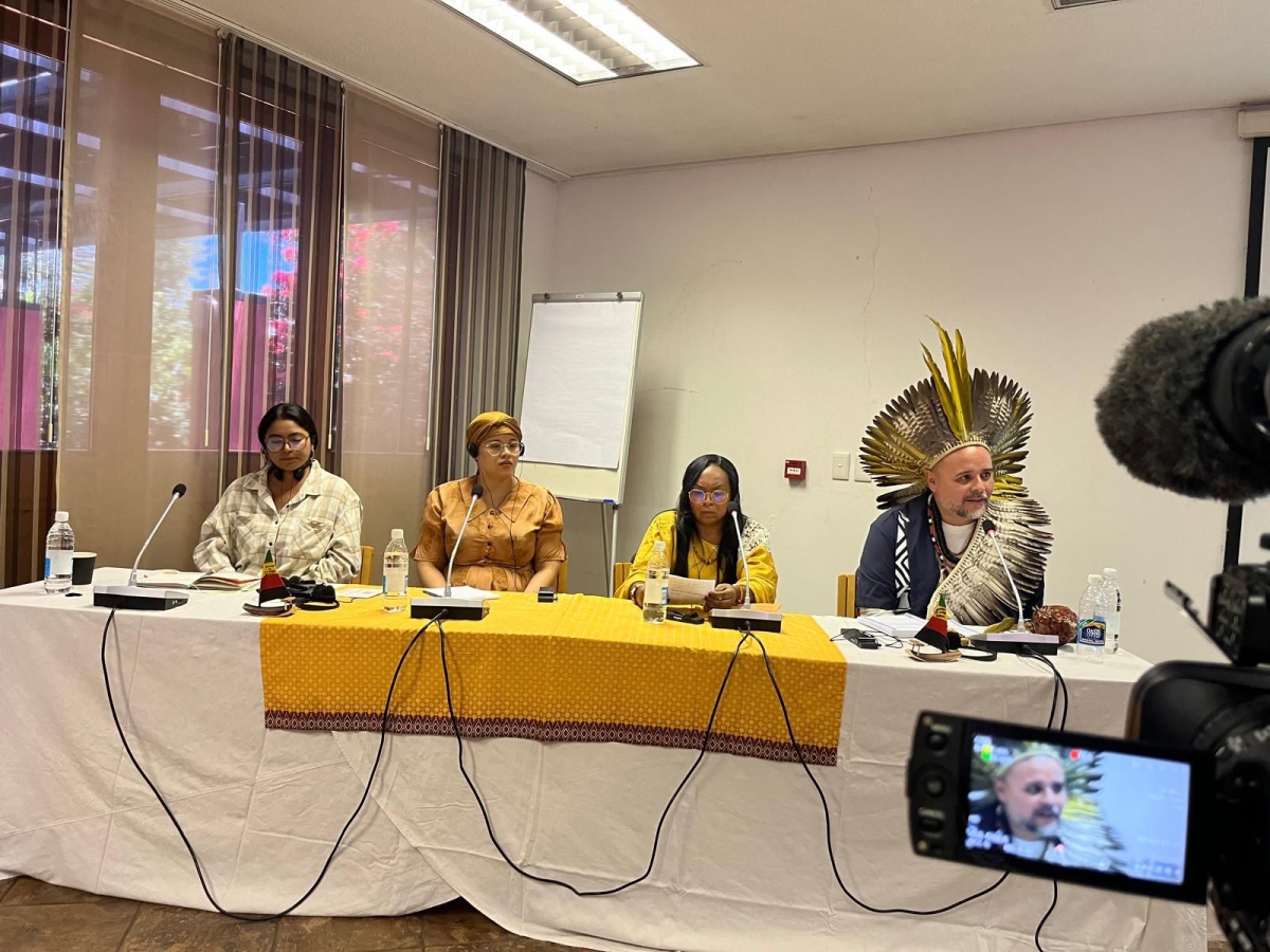 Lower photo: Roundtable discussion on indigenous and traditional populations in green hydrogen. From left to right: Paulina Hidalgo (Tanti Foundation, Chile); Louivenzia Komases (Nama Traditional Leaders Association Youth Forum, Namibia); Jazmín Romero Epiayú (Feminist Movement of Wayuu Women and Girls, Colombia); Paulo Anacé (Anacé Indigenous People, Brazil). (Credit: Martin Gruber).
