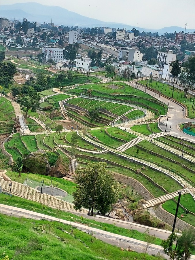 Another interesting feat is the remarkable rehabilitation of the environment: the cleaning up of the previously highly polluted rivers, terracing the river banks - with the help of invited specialists from the (southern Ethiopian) Konso people - to avoid flooding, installing water purification plants, proclaiming laws that forbid the unfiltered pollution of the urban rivers and streams and also, in a more problematic fashion but part of the process of urban rehabilitation, ‘slum clearance’: the removing of old, poor, popular neighbourhoods and the move of its inhabitants elsewhere.