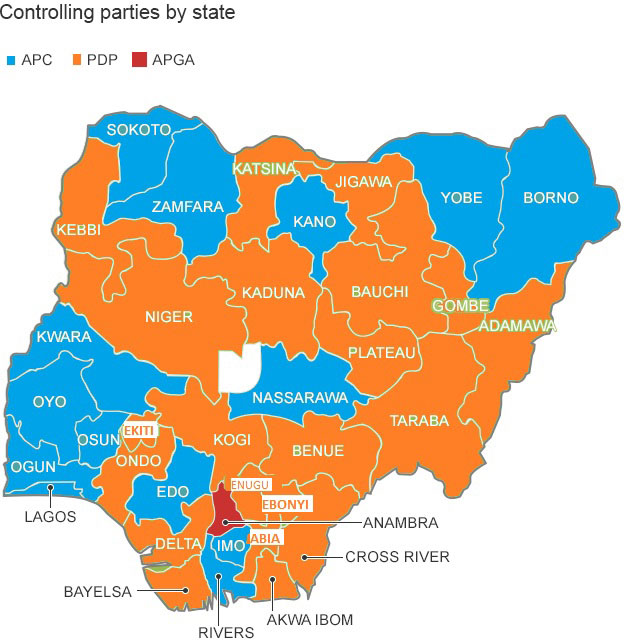 Figure 2: New configuration of states controlled by parties from March 28, 2015, presidential elections