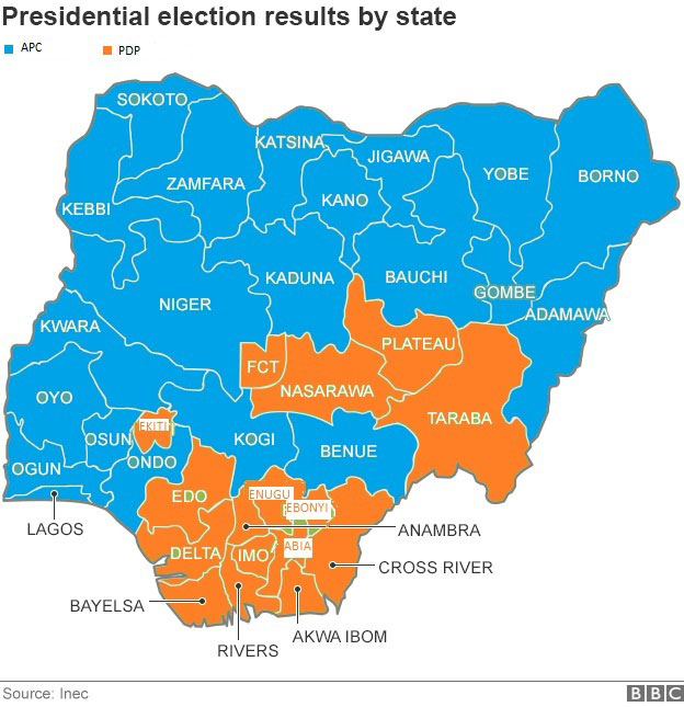 (Source: Adapted from INEC figures and BBC online illustration, April 2015.)