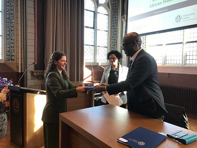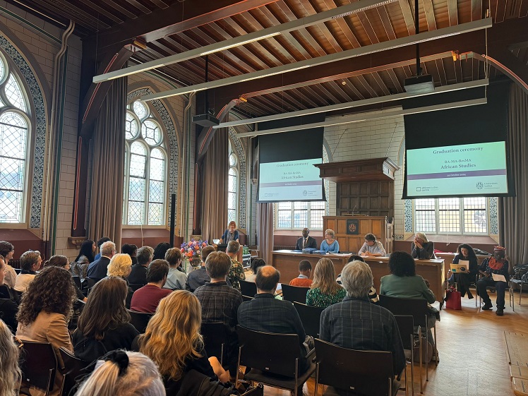 The ceremony was co-chaired by Azeb Amha, Chair of the Research Master programme, and Karin Nijenhuis, Chair of the Master Programme, in the presence of Mayke Kaag, Director of Studies at the ASCL, who gave an opening speech, Chibuike Uche, member of the Board of Examiners, and a number of thesis supervisors: Harry Wels, André Leliveld, Annachiara Raia, Walter Nkwi Gam, and Akinyinka Akinyoade, as well as family members and friends of the graduates. The event was organised with the help of Lisah van der Heyden from Education and Student Affairs, Faculty of Humanities.
