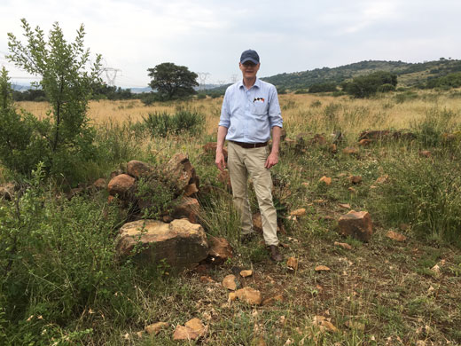 Jan-Bart Gewald among the remnants of the city of Kweneng, destroyed circa 1820.