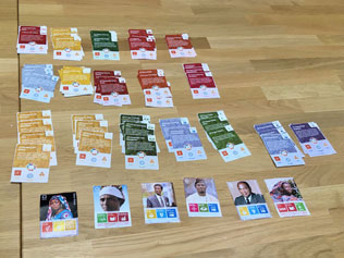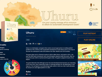 The game plays out in a fictional African country called 'Uhuru' and starts in 2015, the year the Sustainable Development Goals (SDGs) were introduced. Played in teams of six players, each round the game advances with four years. After six rounds the year 2030 is reached and the game ends. It serves to illustrate that although sector-focussed developmental decisions are rewarding in the short term, joint cooperation leads to a winning situation for all stakeholders in the long run.